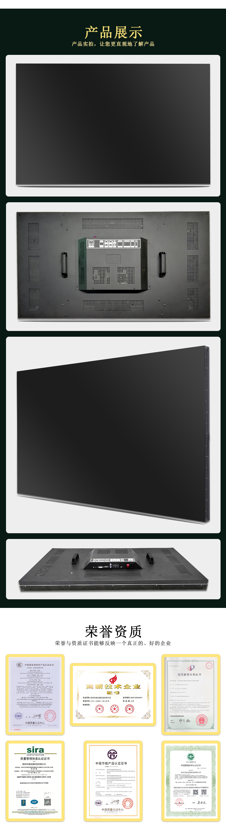 【美佳愛(ài)-4k液晶拼接屏生產(chǎn)廠家電話(huà)400-997-9971】原裝LG49寸液晶拼接屏1.8mm500cd產(chǎn)品通過(guò)ISO9001_3C_節(jié)能認(rèn)證等30多項(xiàng)認(rèn)證,主營(yíng)LG/京東方/三星大屏幕電視墻,其尺寸有32寸40寸43寸46寸49寸55寸65寸75寸液晶拼接單元,也有曲面,弧形,柔性,無(wú)縫LED顯示屏,顯示器,超窄邊高清監(jiān)視器,提供企業(yè)展廳展示,KTV,酒吧,會(huì)議室,視頻監(jiān)控系統(tǒng)解決方案設(shè)計(jì)-報(bào)價(jià)-安裝施工-售后超窄邊維修等服務(wù)