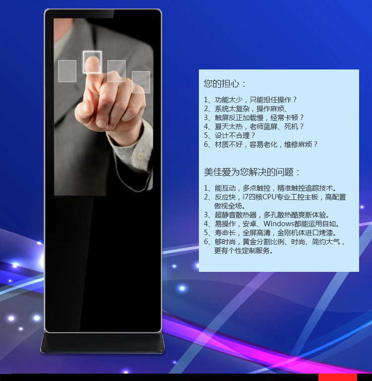 【深圳市美佳愛-液晶廣告機,觸摸一體機生產廠家電話400-997-9971】65寸紅外觸摸一體機(安卓/立式)產品通過ISO9001_3C認證,主營多點紅外/電容式觸摸屏一體機,觸控查詢一體機,其他尺寸18.5寸21寸24寸27寸32寸40寸43寸46寸49寸55寸65寸75寸86寸98寸100寸多功能多媒體教學會議一體機,戶外立式/壁掛雙面廣告機,單機版/安卓網絡廣告機 豎屏樓宇電梯廣告機,長條型屏,工業級工控電腦觸摸顯示器,大尺寸觸摸屏查詢系統,商顯平板電腦電視,提供報價價格,安裝施工,售后維修等