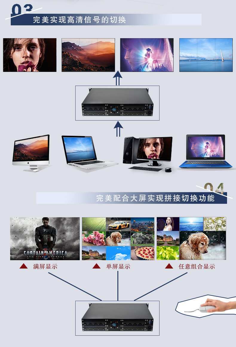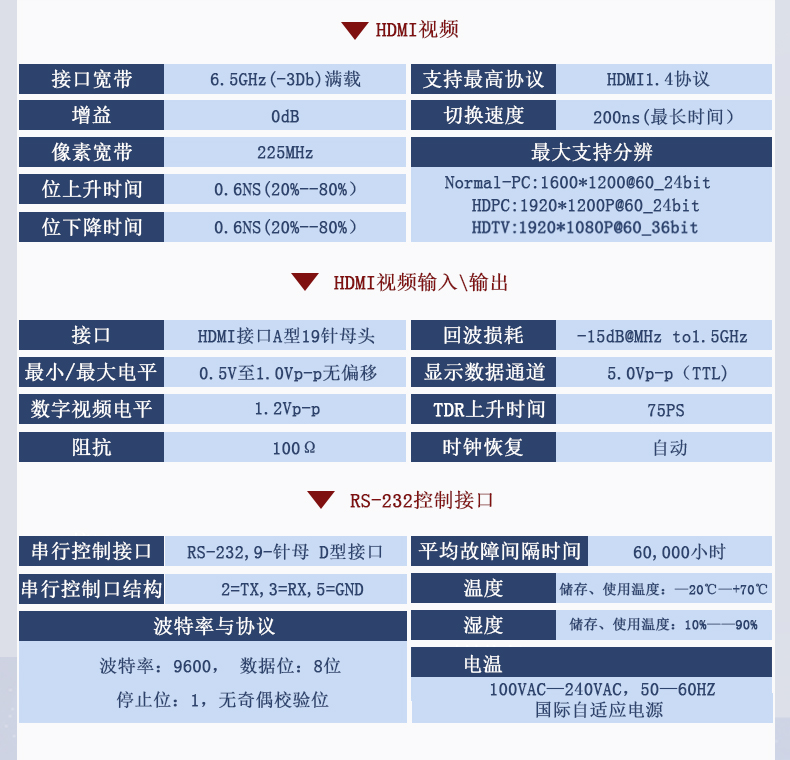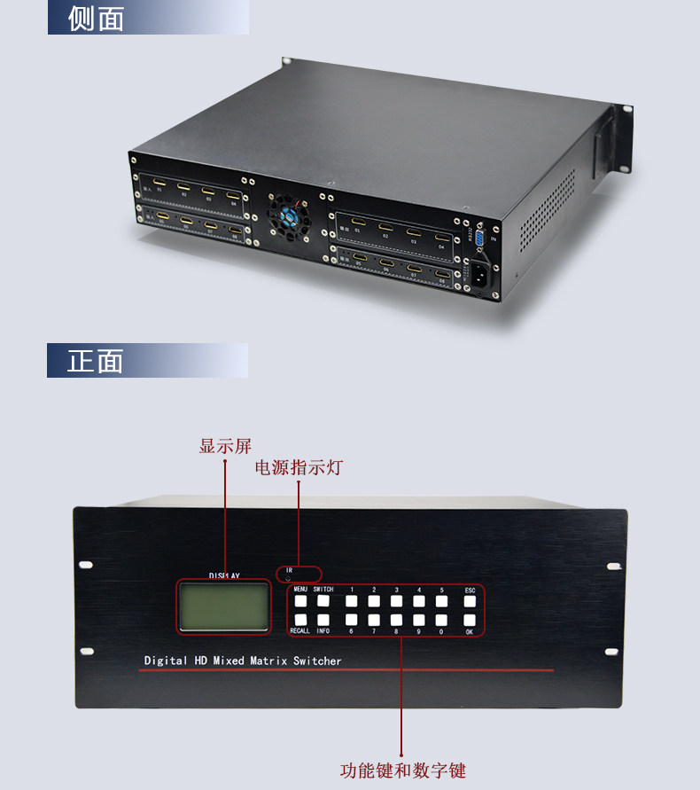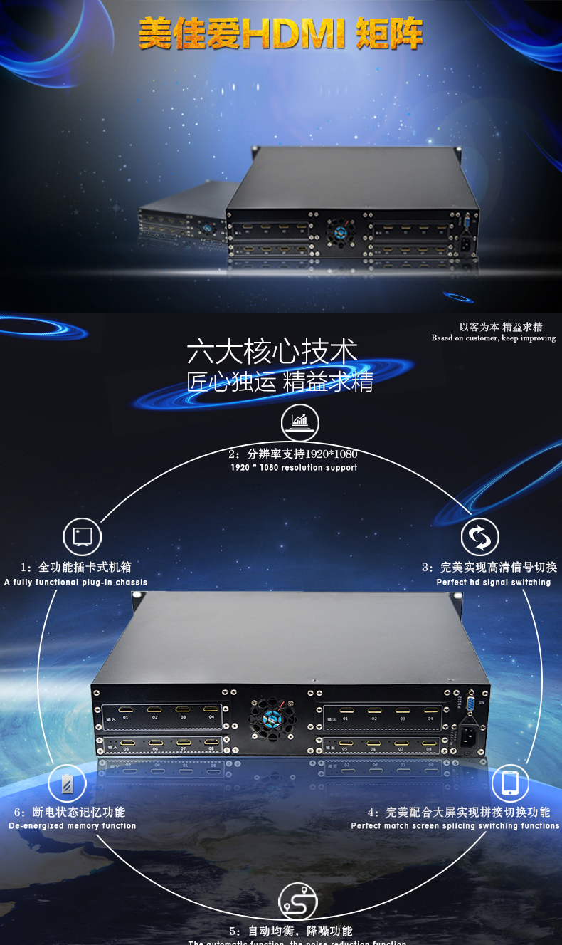 24路系列(24進(jìn)4出;24進(jìn)8出;24進(jìn)16出;24進(jìn)24出;24進(jìn)32出)-HDMI高清全數(shù)字矩陣切換器, 所有端口支持藍(lán)光DVD(支持HDCP);輸入輸出自動(dòng)均衡,輸入加輸出傳輸距離大于40米(不需配帶芯片的HDMI線);鋁拉絲面板,帶藍(lán)光液晶顯示屏顯示操作狀態(tài);帶串口控制,可選配網(wǎng)口;所有輸入端口支持現(xiàn)場(chǎng)寫(xiě)EDID,所有輸出端口可讀回EDID。
