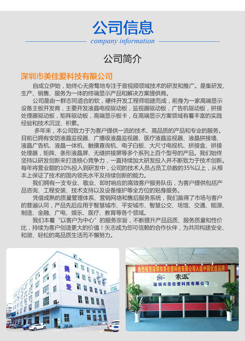 關(guān)于我們 公司介紹 企業(yè)文化 聯(lián)系我們 | 產(chǎn)品中心 液晶拼接屏 液晶廣告機(jī) LED顯示屏 觸摸一體機(jī) 液晶監(jiān)視器 | 新聞資訊 公司新聞 行業(yè)動態(tài) | 工程案例 店面專顯案例 商用專顯案例 安防專顯案例 | 服務(wù)支持 定制服務(wù)流程 售后服務(wù) | 全國服務(wù)熱線 18923424118 地址:深圳市光明新區(qū)公明街道振興路8號 后海旭發(fā)科技園2棟3樓 | ![]() |