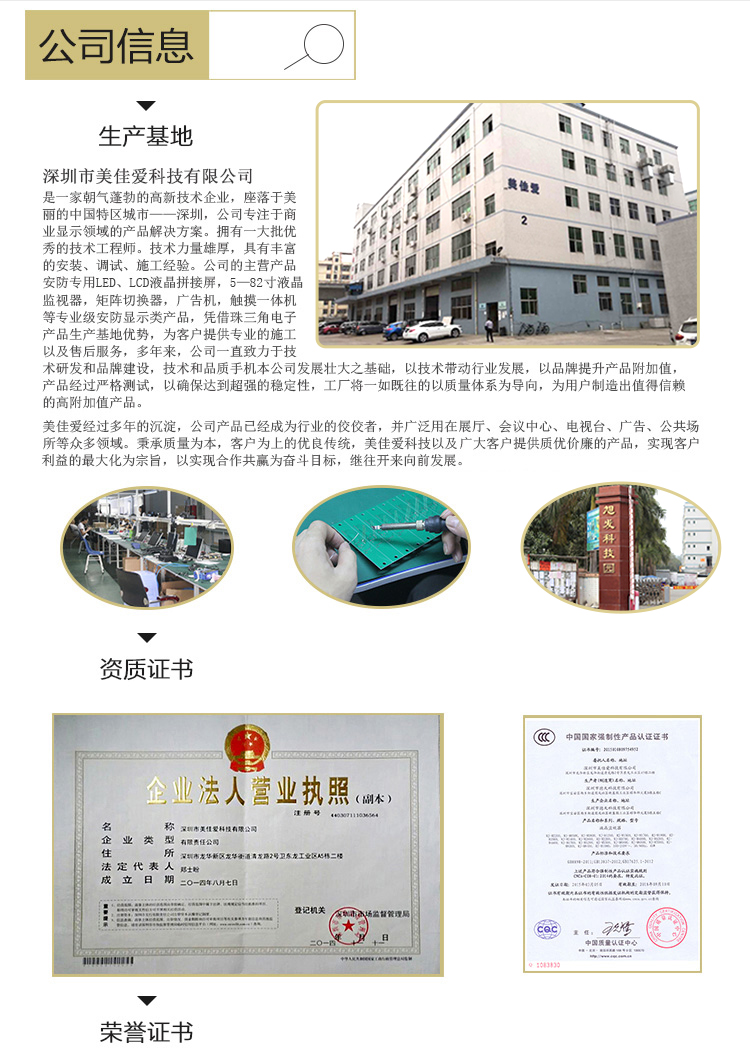 【深圳市美佳愛-液晶廣告機,觸摸一體機生產(chǎn)廠家電話400-997-9971】紅外/電容壁掛觸摸屏電視電腦一體機產(chǎn)品通過ISO9001_3C認證,主營多點紅外/電容式觸摸屏一體機,觸控查詢一體機,其他尺寸18.5寸21寸24寸27寸32寸40寸43寸46寸49寸55寸65寸75寸86寸98寸100寸多功能多媒體教學(xué)會議一體機,戶外立式/壁掛雙面廣告機,單機版/安卓網(wǎng)絡(luò)廣告機 豎屏樓宇電梯廣告機,長條型屏,工業(yè)級工控電腦觸摸顯示器,大尺寸觸摸屏查詢系統(tǒng),商顯平板電腦電視,提供報價價格,安裝施工,售后維修等