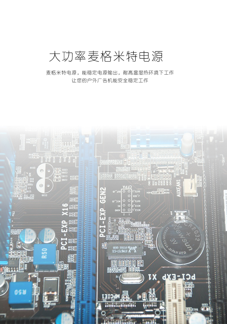 3.2 自主研發智能溫控系統控制盒,可以根據廣告機內部溫度,智能調節整機內部空氣和外部空氣進行時時循環,所有外界風先進入過濾網,把風分成屏前/后兩風道循環。