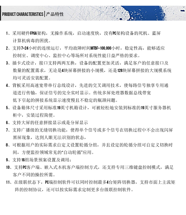 - 支持無縫切換,處理器內部集成高清信號處理機制,保證信號切換時無延時、無藍屏、無黑屏等中間過渡狀態。